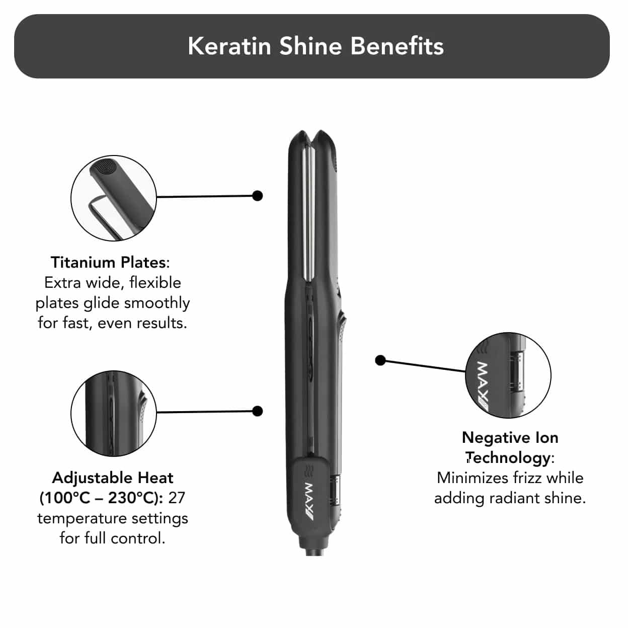 - Flexibele titanium platen: Extra breed en perfect voor dik of lang haar.